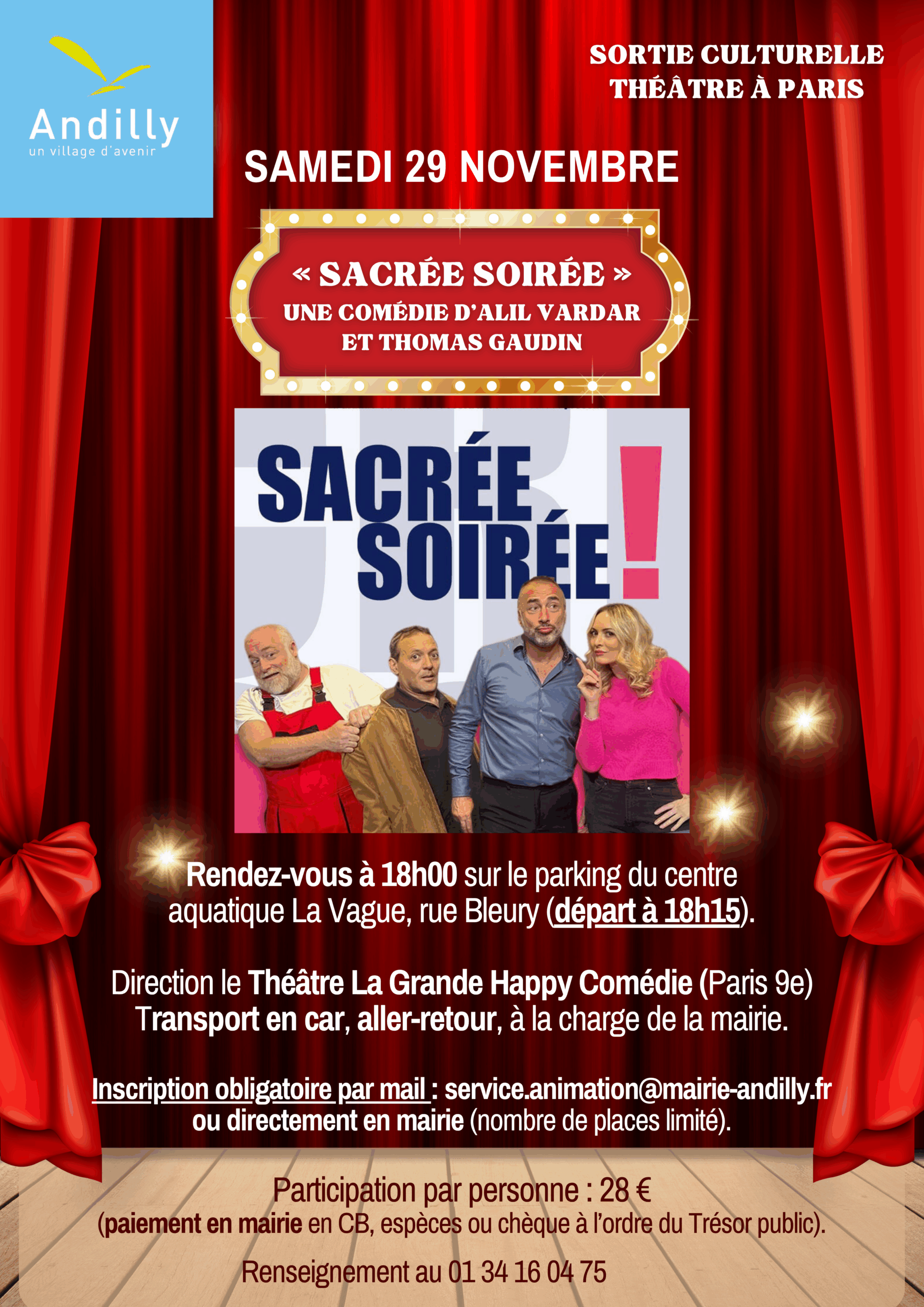 Rendez-vous à 18h00 sur le parking du centre aquatique La Vague, rue Bleury (départ à 18h15). Transport en car, aller-retour, à la charge de la mairie. Direction le Théâtre La Grande Happy Comédie (Paris 9e).
